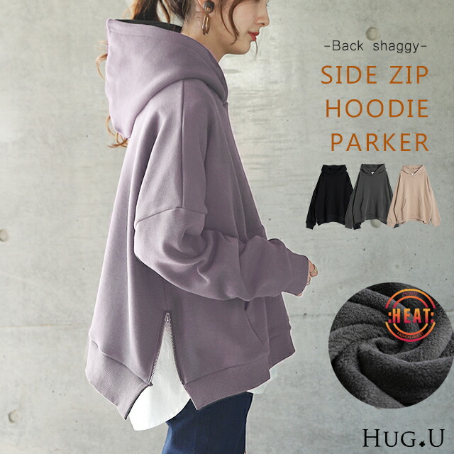 垢抜けサイドジップ あったか裏シャギーパーカー あす楽 パーカー レディース 裏シャギー スーパーセール期間限定 トップス トレーナー スウェット スエット プルオーバー フード 大きいサイズ グレー 春 小顔 フーディー Hug U 裏起毛 無地 スリット 夏 サイドジップ 黒